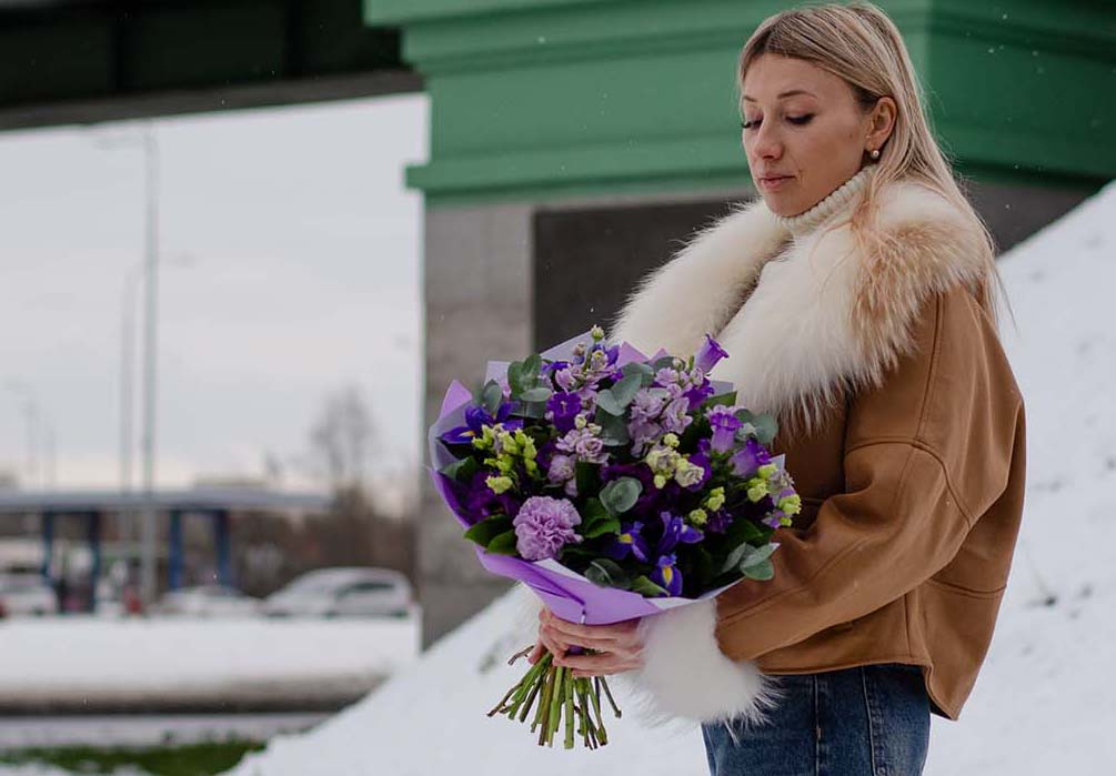 Этот букет — воплощение благородной роскоши и глубины фиолетовой палитры. Строгие и графичные ирисы, символизирующие мудрость, переплетаются с шелковистыми соцветиями лизиантуса, создавая основу изысканной композиции. Дополненные пряными левкоями, нежным диантусом и воздушными колокольчиками кампанулы, они образуют текстурное полотно невероятной красоты. Выбрать этот букет из ирисов и лизиантуса — значит отдать предпочтение аристократичной сдержанности и силе характера. Он станет безупречным акцентом в элегантном интерьере или достойным подарком для человека с безупречным вкусом. Купить красивый букет «Фиолетовый бархат» — решение для тех, кто ищет не просто цветы, а произведение флористического искусства.