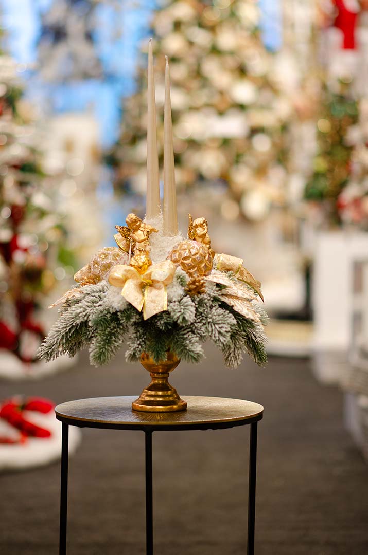 Его окружают роскошные стеклянные шары — с изысканным цветочным декором, благородной огранкой и изящной "сахарной" текстурой, создающие единую гармоничную палитру. Искрящаяся пуансеттия дополняет этот сияющий ансамбль, а перламутровая свеча в центре наполняет композицию теплым живым светом, заставляя золото переливаться еще нежнее.