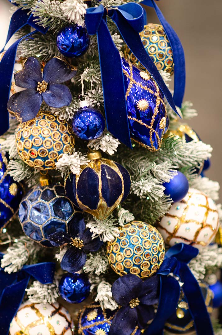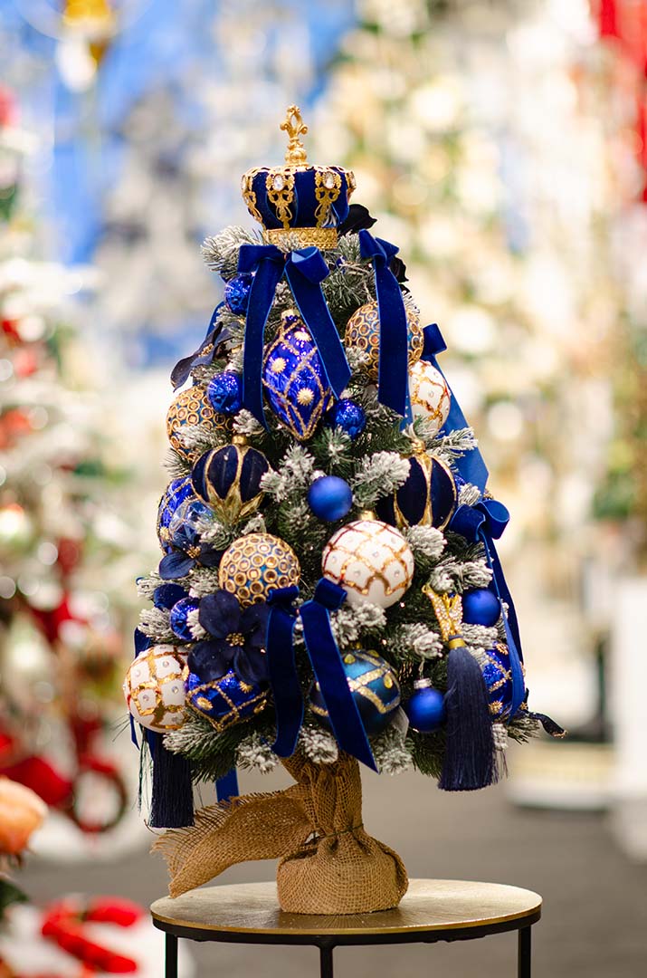 Эта елка в синем цвете — воплощение стиля и гармонии. Изюминка ансамбля — синяя кисточка с золотой бабочкой, добавляющая тонкую асимметрию и шарм. И всё это великолепие венчает золотистая корона, утверждая статус вашего праздничного декора как поистине царского.