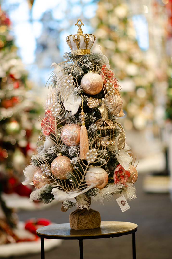Винтажные акценты: Стеклянные шары в розово-золотой гамме с тонким орнаментом перекликаются с антикварными украшениями, а золотистая корона венчает композицию, как символ безупречного вкуса.